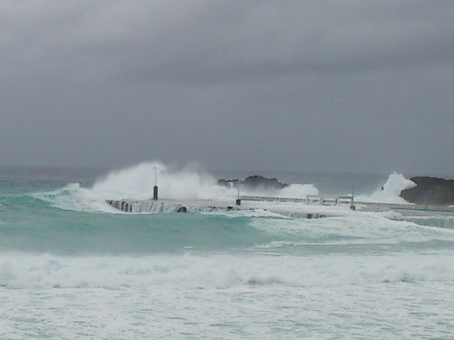 激しい高波に、港がもう全部飲みこまれちゃってます。