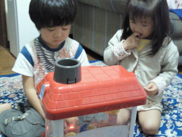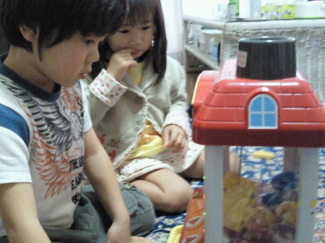 通常はちゃんとガチャポンの中にアンパンマンの景品が入ってるんだけど、こっそりガチャポンの中身を飴に変えてやったら、かいりもちゅらも目の色変えて本気で取りにいってました。