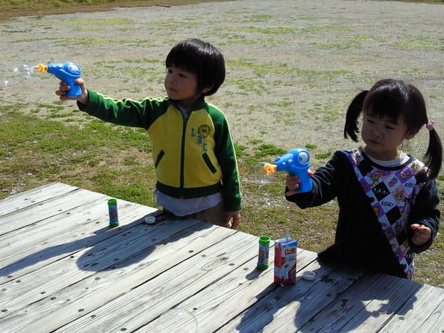 かいりは飛んでくシャボン玉に向かって「待てぇ~!」と追っかけていったり、ちゅらは弾けて消えるシャボン玉を見て、「ちゅらのシャボン玉はぁ?」と少し悲しい顔をしてたり…、でもかなりおもしろかったみたいで、2人とも液がなくなるまで根こそぎ楽しんでました。
