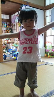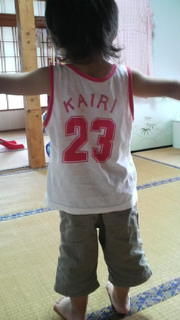 かいりには、高校の頃自分に子供ができたら着させてやろうと思ってたバスケのユニフォームを。
