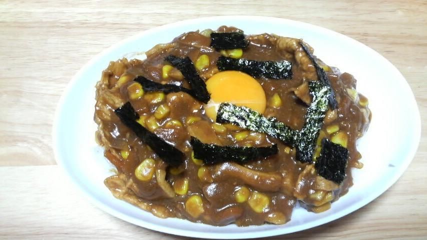 カレーの材料は、豚小間、ニンジン、玉ねぎ、エリンギ、コーン、そして最後に卵の黄身をおとしてのりをパラパラで完成!
