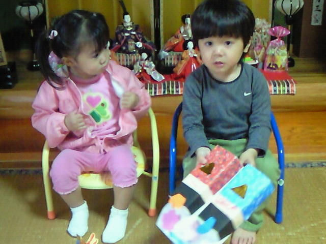 保育園でもひなまつりの行事があったみたいで、かいりとちゅらそれぞれおひなさまを作ってきました。