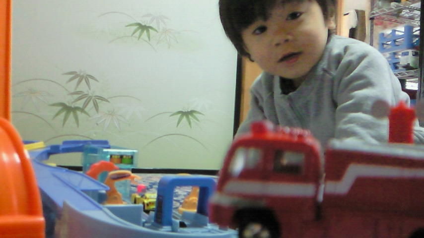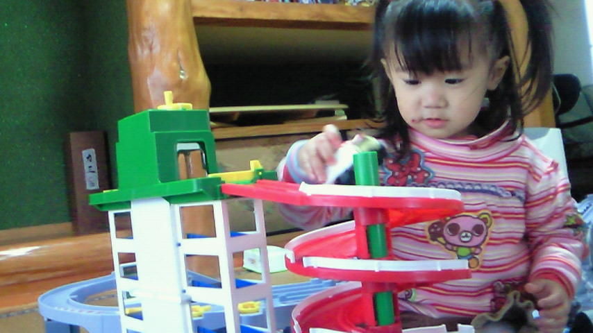 かいりは相変わらず真剣な顔で興奮しながら遊び、ちゅらはこの後少し飽きたのか、トミカワールドの破壊に走ってました。