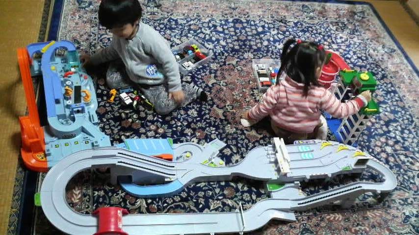なんか2人とも外に遊びに行きたくてストレスたまってそうなので、トミカ関係のおもちゃを全部出してやりました。