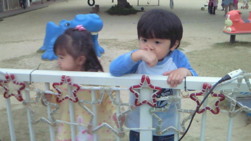 うちのチビ達、お迎えの時間になると保育園の入り口のところの柵の前でよく2人で待っています。