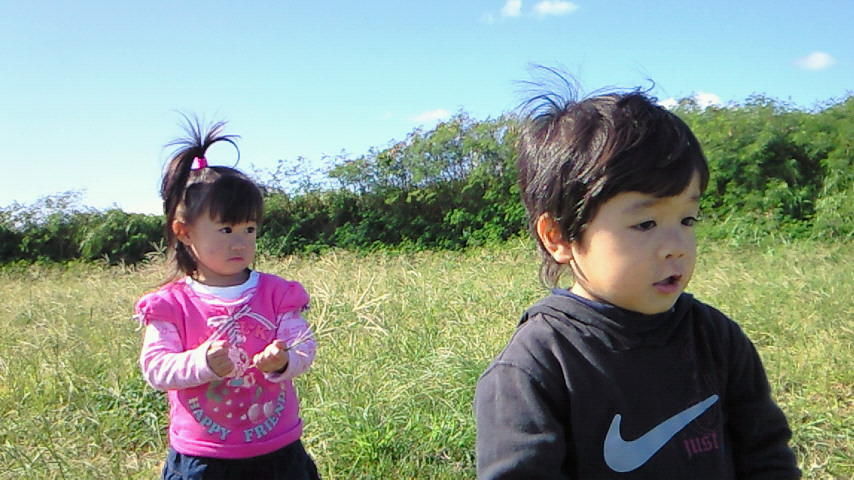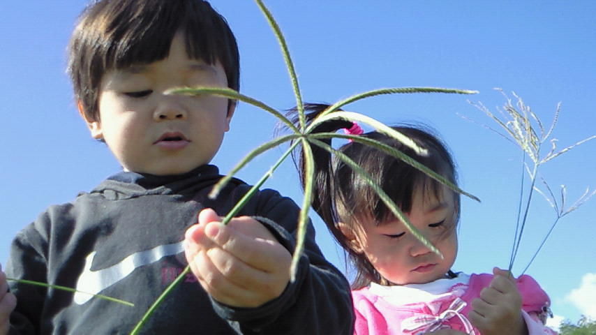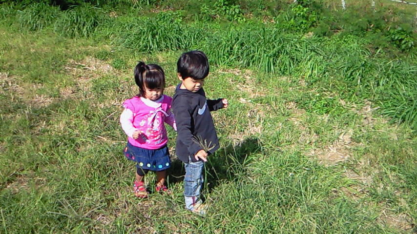 待機中、あんまり草っ原で遊んだことがないかいりとちゅらは、無数に生えてる草に夢中・・・。