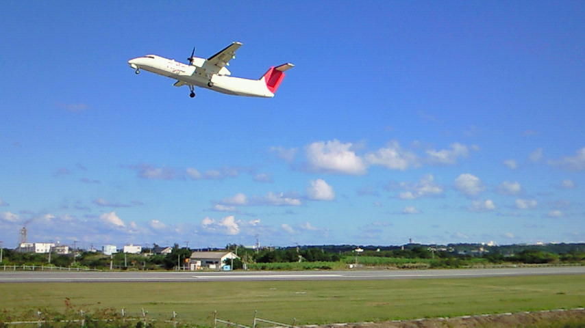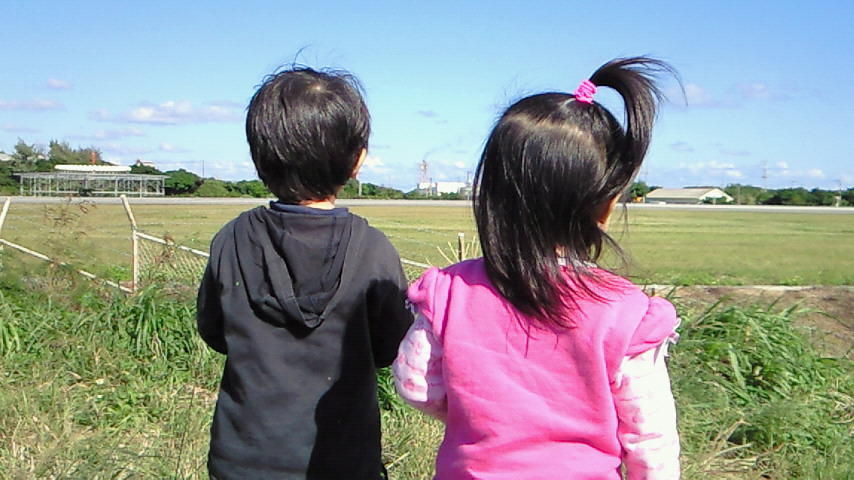 ドライブ中、あまりにも景色がきれいだったんで車を停めて見ていると、与論空港に到着する飛行機をかいりが見つけて、「ひこうき~!ひこうき~!」と叫んでいたので、仕方ない、今到着した飛行機が飛び立つのをもっと間近で見せてやるよと飛行場の近くに急いで行ってきました。