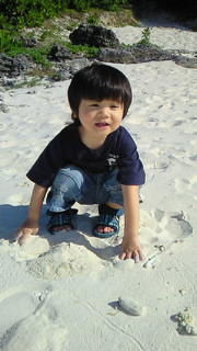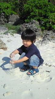 与論のサラサラした砂が気に入ったみたいで、ずっと砂遊びしてました。