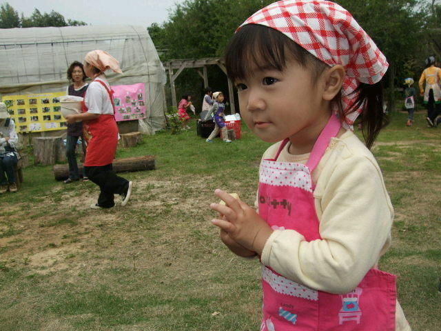 時間通りに保育園の広場みたいなところに行ってみると、保育園の園児達に紛れてかいりがエプロン姿でいました。