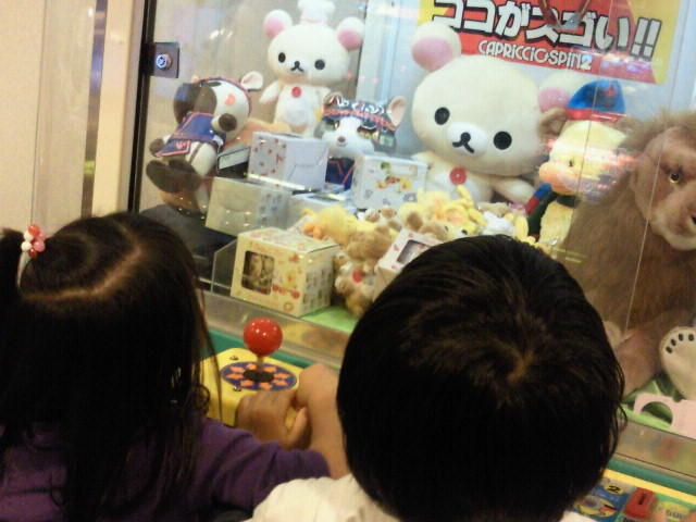 さっそくかいりとちゅらにやらせると、いつも家でやってるミニUFOキャッチャーのどでかいバージョン(本物)にかなり興奮して、まぁ当然のことながら、これやるから早く小銭をくれと右手を差し出され…。