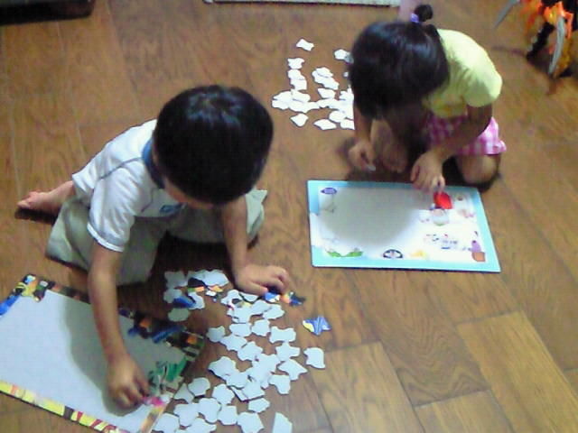 2、3回完成させただけで、かいりはシンケンジャーのパズルをもう全ての箇所を覚えてるんじゃないかってくらいスイスイできるし、ちゅらもプリキュアのパズルを今では5分もあれば片づけてしまいます。