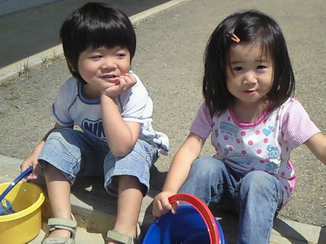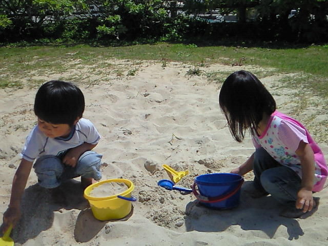 公園に着くと、さっそく砂場で夢中で遊び出す2人。