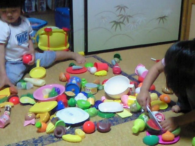 「はい、じゃ食材を使って何か作って持ってきて!」とかいりとちゅらに言うと、せっせと何かを作り始めました。(真似だけどね。)