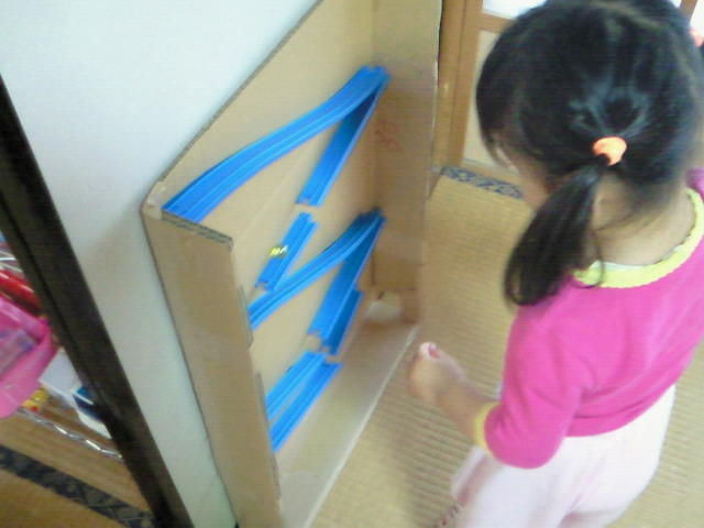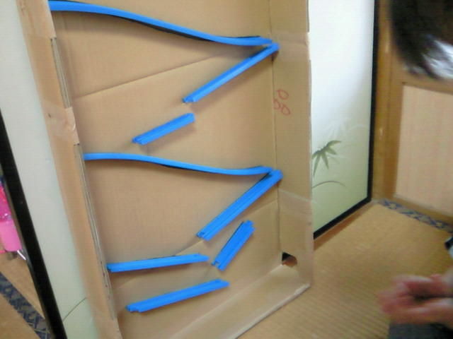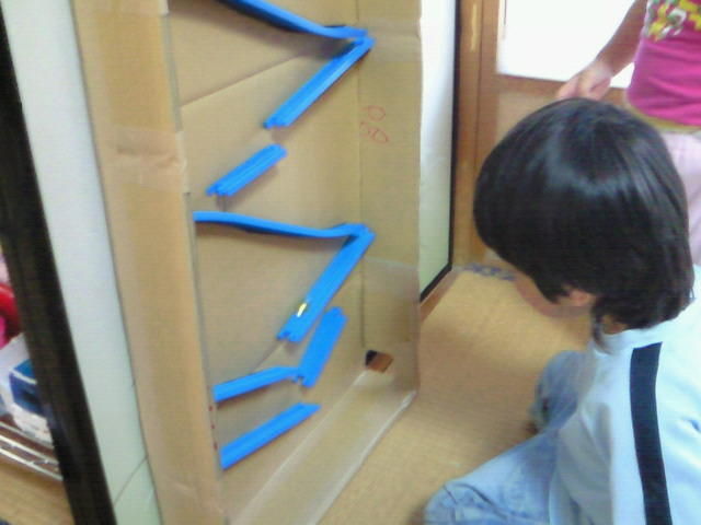 プラレールのレールを段ボールに引っ付けて、ビー玉が上から転がり落ちるだけ…。